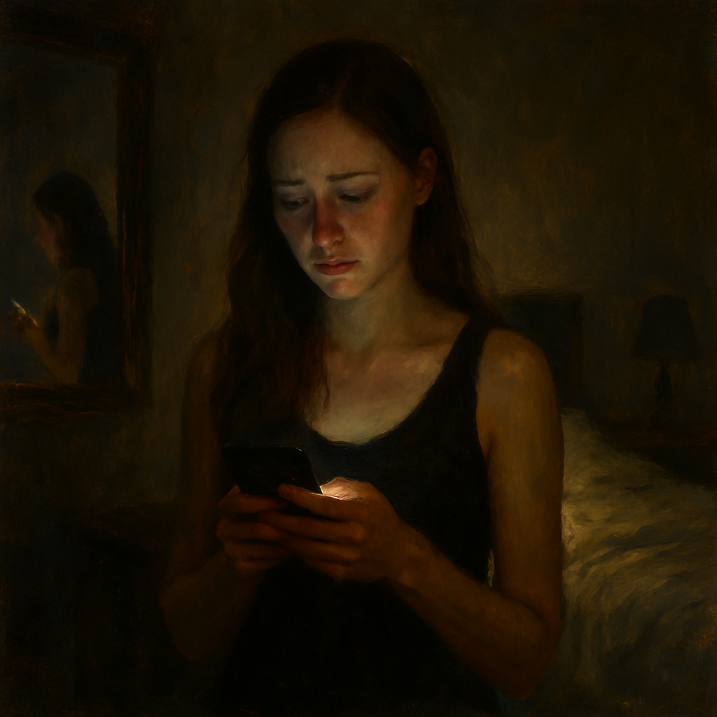 Antes de dormir, se miraba al espejo, habiendo gastado todas las sonrisas del día, que guardaba en el teléfono como una joya preciada.