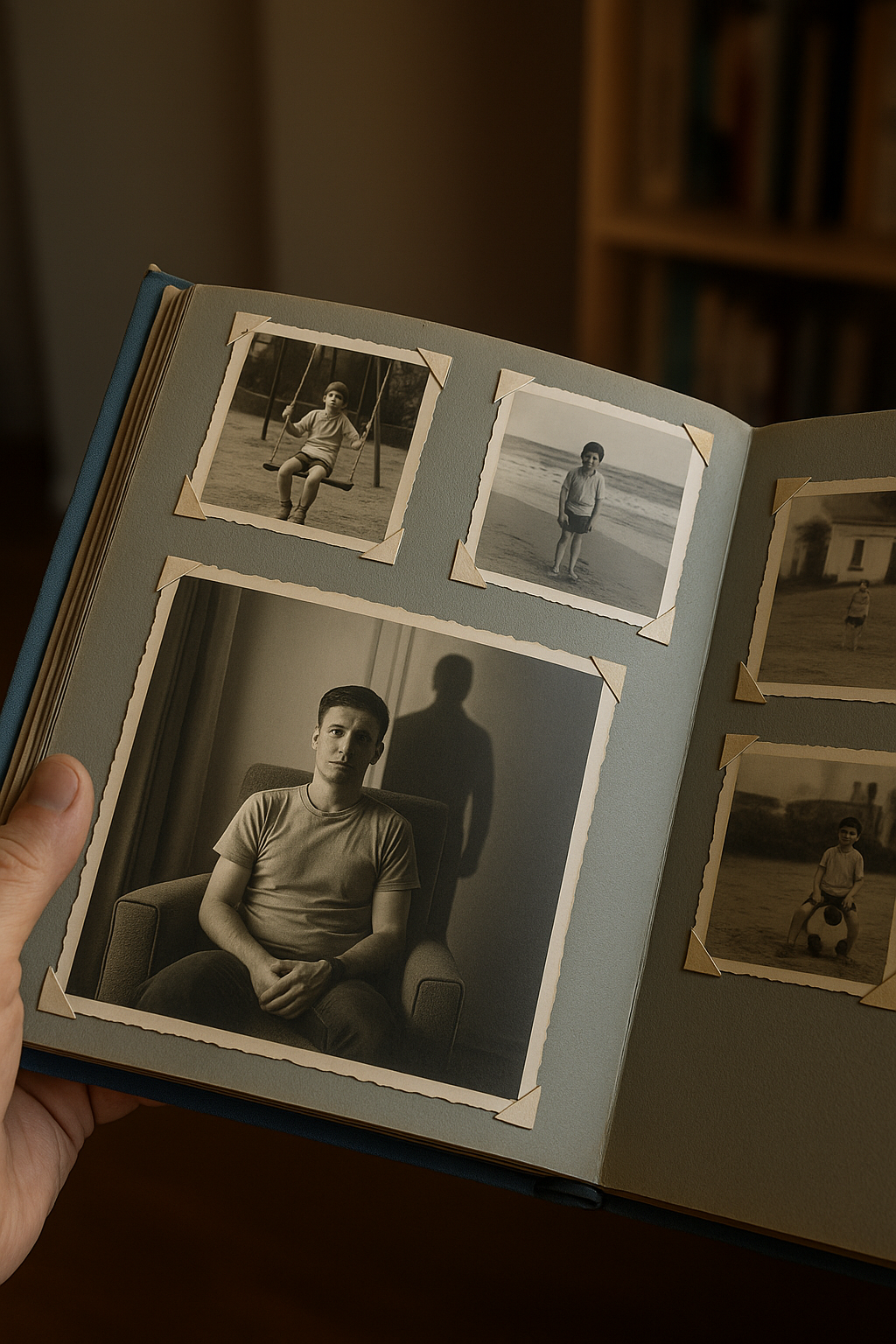 Aparecieron fotos que no recordaba. En una estaba en un parque que no conocía, montado en un columpio oxidado. En otra, sentado en el porche de una casa extraña, con un balón en las manos. Más adelante, en la orilla de una playa que jamás había pisado.